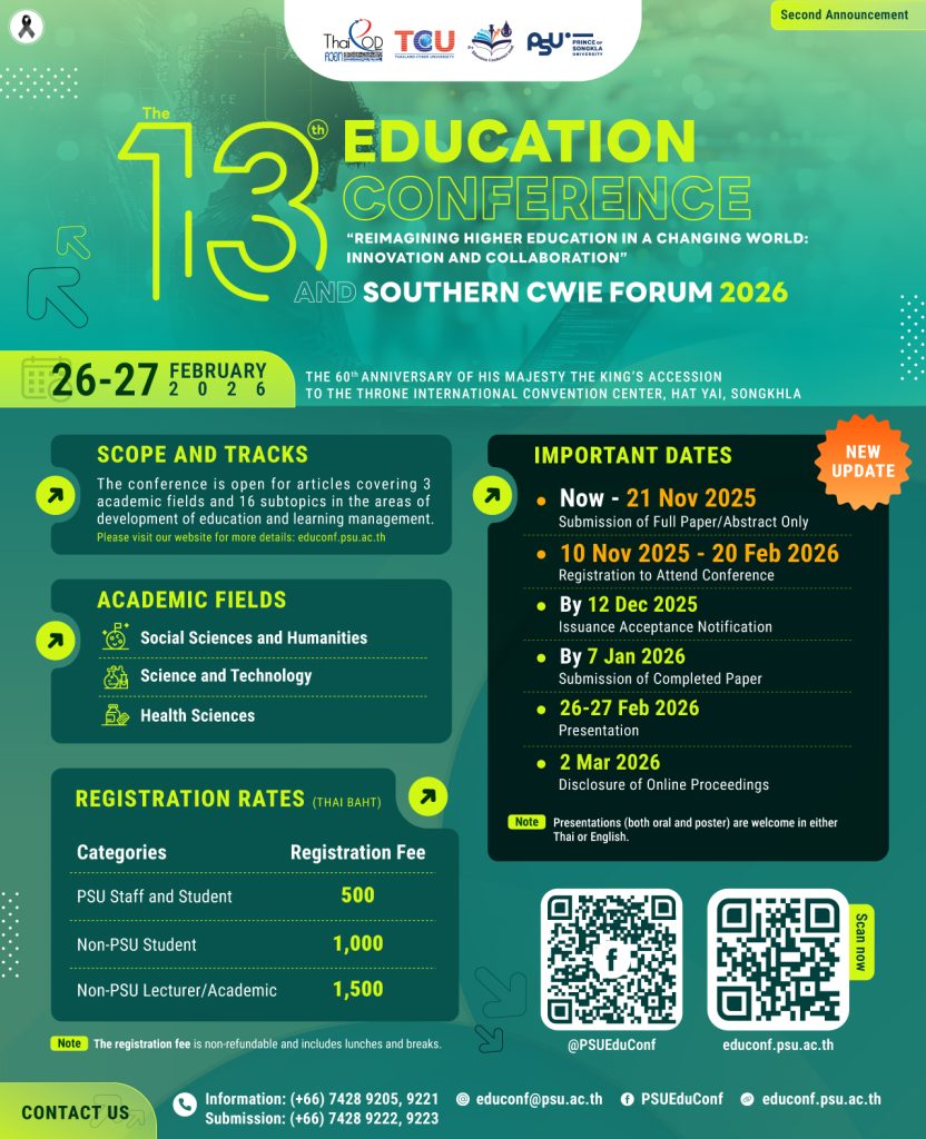 The Association of Professional and Organizational Development Network of Thailand Higher Education (ThaiPOD Network) together with Prince of Songkla University, organizes the 13th Education Conference on the topic “Reimagining Higher Education in a Changing World: Innovation and Collaboration”. The conference will take place from 26 to 27 February 2026 at the 60th Anniversary of His Majesty the King’s Accession to the Throne International Convention Center, Prince of Songkla University. The ThaiPOD Network and Prince of Songkla University invite interested faculty members, educational personnel, and students to attend the 12th Education Conference and submit research papers for presentation.